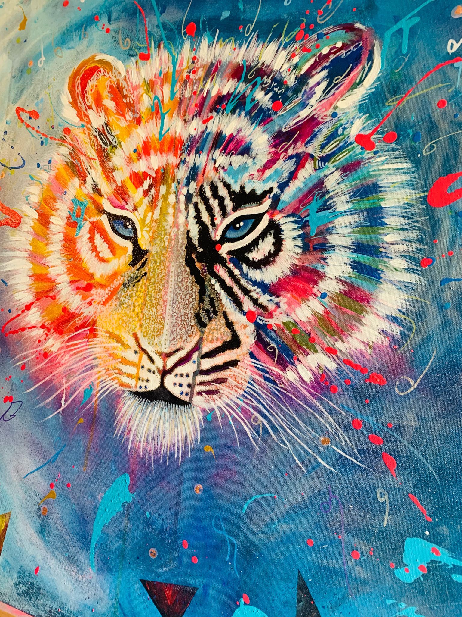 Peinture Acrylique, spray aérosol, marqueurs, vernis sur toile de coton