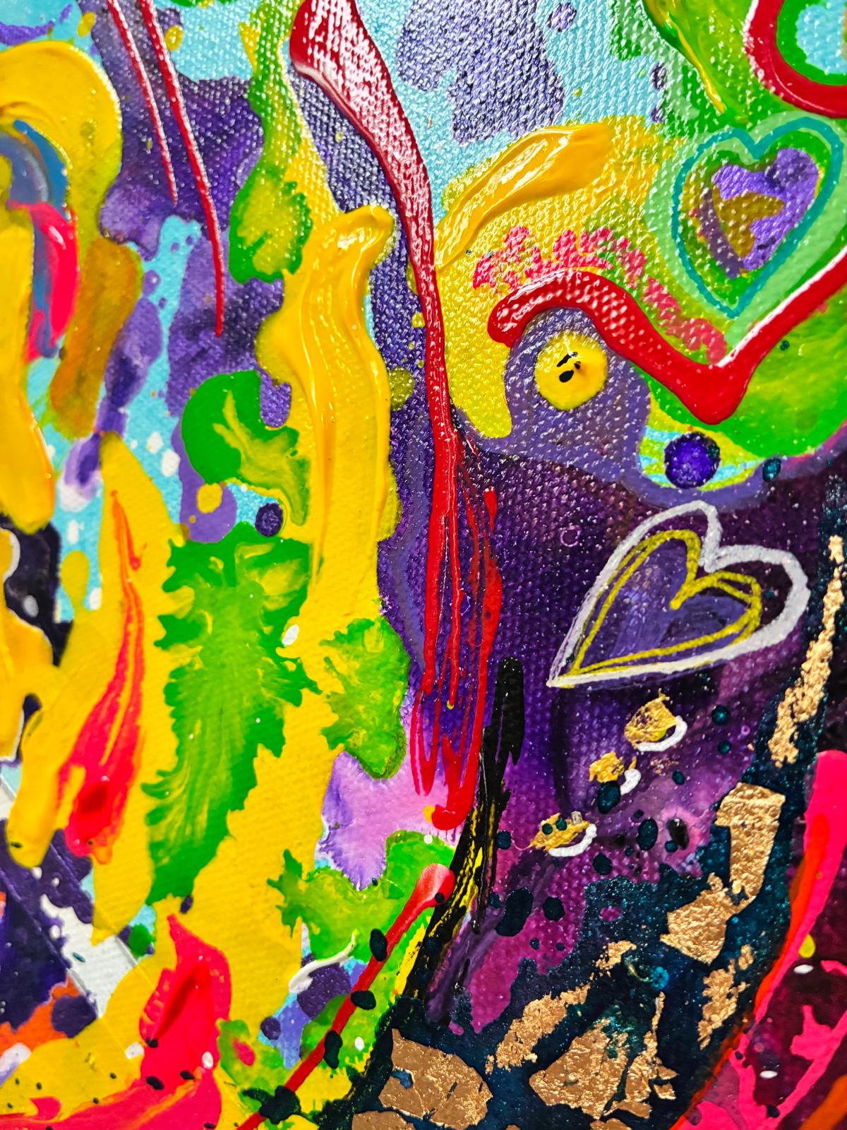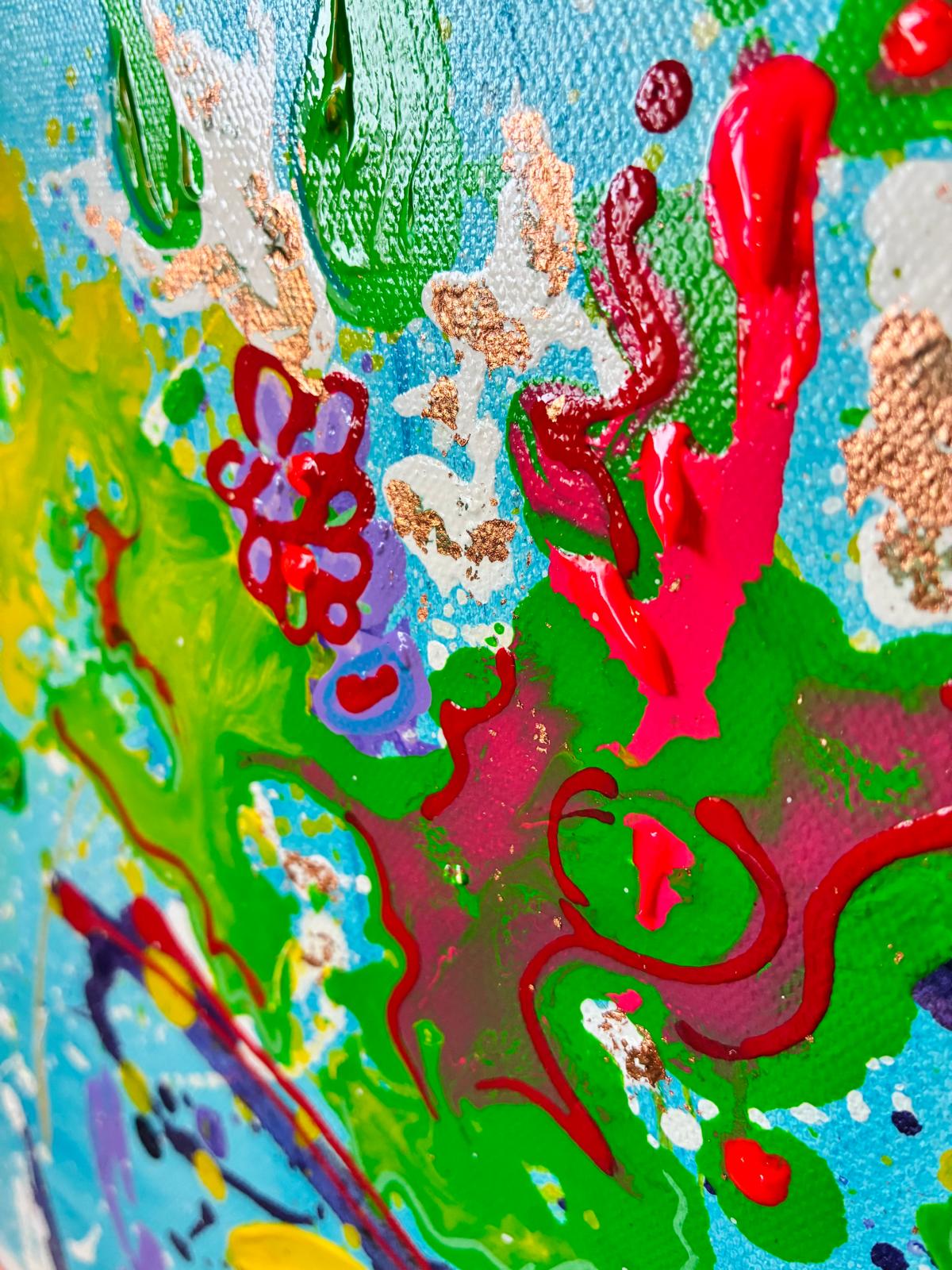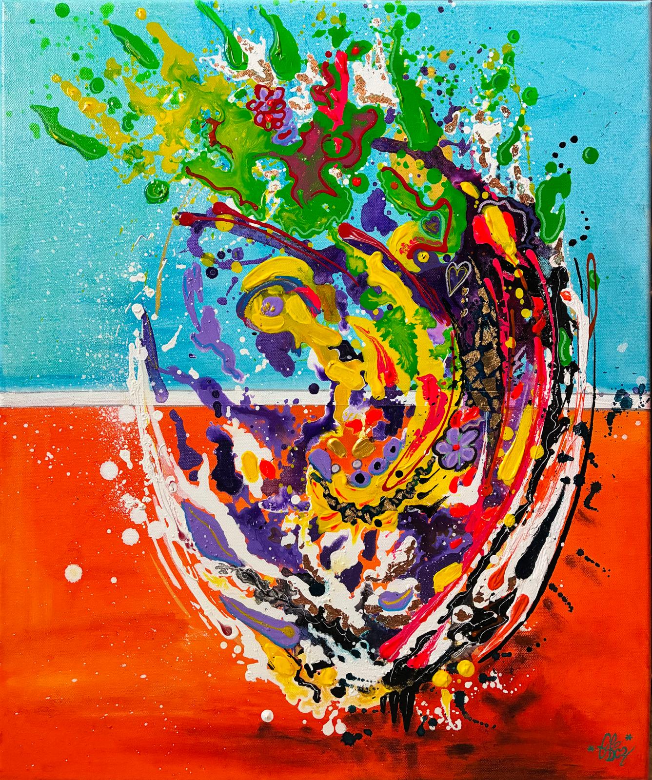 Peinture Acrylique, marqueurs acryliques, feuilles d’or, vernis sur toile de coton de dimension 60 cm X 50 cm