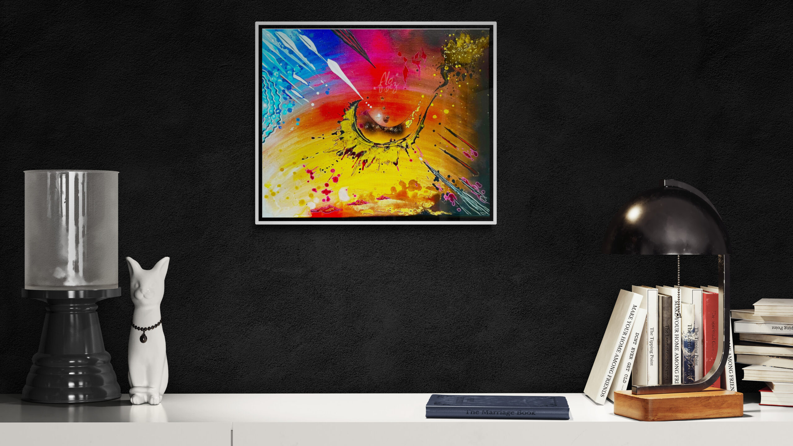 Peinture Acrylique, marqueurs, spray aérosol, feuilles d’or et vernis sur toile de coton de dimension 50 cm X 60 cm