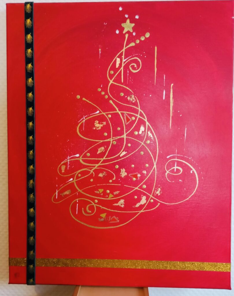 Pour accompagner cette annonce, découvrez l’un de mes tableaux saisonniers qui égaye l’intérieur d’une famille. Un sapin de Noël abstrait, rouge profond et or lumineux.